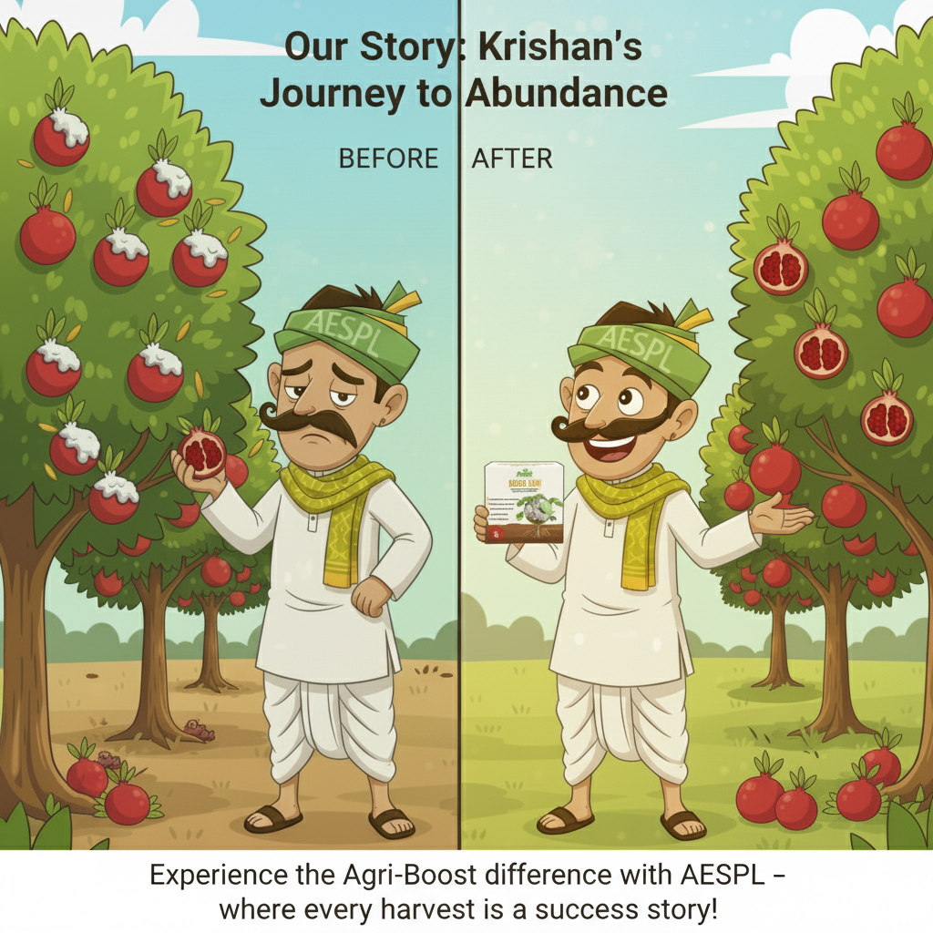 One sunny morning, a wise old traveler passed through the village and noticed Krishan’s predicament. He approached the farmer and introduced him to AESPL’s revolutionary Agri-Boost solution. Intrigued, Krishan decided to give it a try. He meticulously followed the instructions, applying the Agri-Boost to his pomegranate trees.